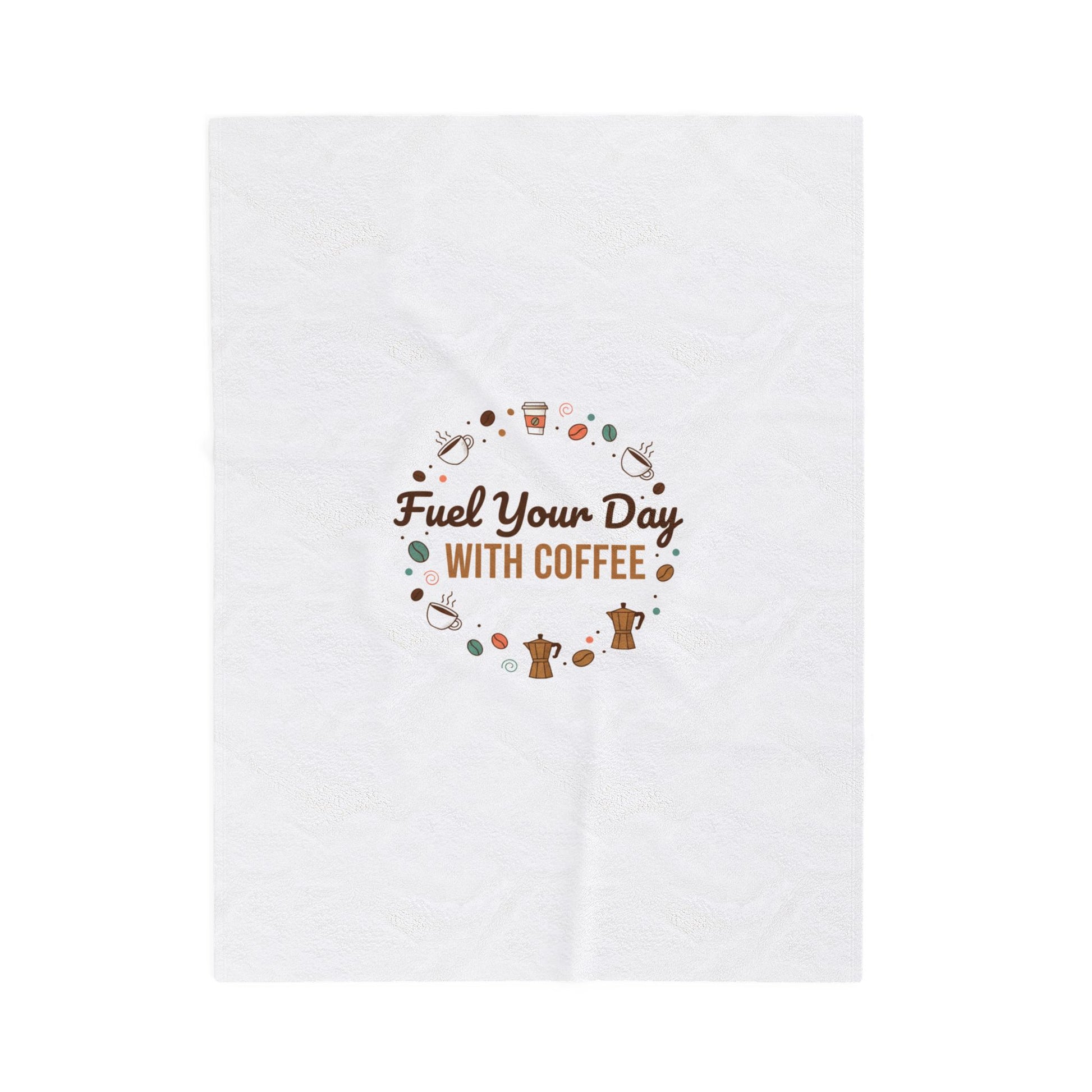 A soft velveteen blanket printed with a small, minimalist coffee-themed badge: warm brown script reading “Fuel Your Day” paired with bold sans “WITH COFFEE,” surrounded by tiny espresso cups, coffee beans and steam accents. The design uses a cozy palette of browns, cream and muted green dots for a cafe-ready, morning-ritual vibe that reads clearly on quick-scroll product pages. This blanket layers easily into coffee corners, home offices, or couch mornings for someone who likes lighthearted caffeine humor and understated cafe identity in their everyday linens.