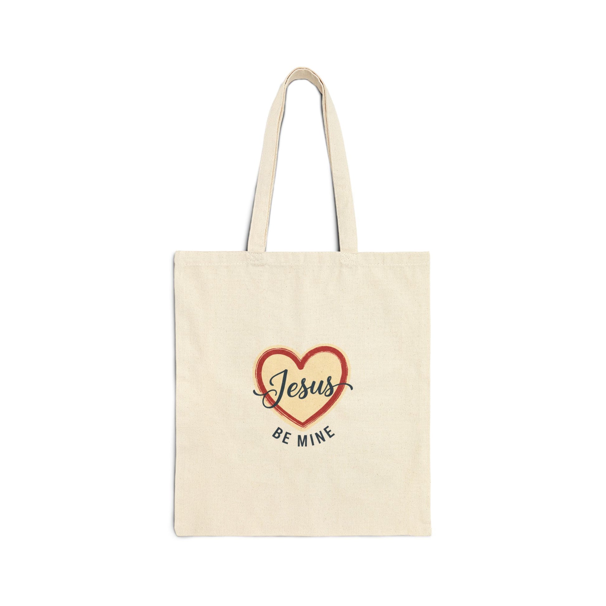 This cotton canvas tote brings gentle faith and everyday function together. Soft-natural canvas carries a small, hand-drawn heart graphic with “Jesus” script and the subtle phrase “be mine,” creating a quiet, hopeful accent that fits into daily rhythms. The heavy-weight fabric holds groceries, Bibles, or market finds without sagging. Reinforced self-fabric handles sit comfortably on the shoulder for errands, church nights, or casual meetups. Neutral tones let the tiny artwork be the focal point while blending easily with jeans, sweaters, or layered church outfits.